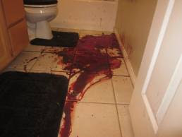 It is common for blood cleanup and crime scene cleanup to involve concrete and asphalt. Unfortunately, concrete is absorbent and can stain. Quality Restoration Services utilizes two methods to remove blood from concrete and asphalt. Our preferred method is through pressure washing and simultaneous vacuum recovery of all blood and waste water runoff. The copious amounts of water and high powered vacuum allows us to actually extract the blood out of the porous concrete. If the blood is located outside of our trucks 100 foot reach, we revert back to performing crime scene cleanup by hand. This method involves using solutions to help break down the blood along with scrubbing tools and absorbent cloths. If concrete is not sealed or the sealer is old, blood stains may occur. We make every effort to completely erase any signs or reminders of what has occurred
